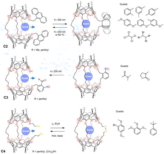 Cages C2–C4 showed specific examples of gating mechanisms that resulted in guest release in response to specific stimuli (Figure 2). Cage C2 features a photoswitchable gate based on the reversible dimerization of anthracene. Irradiation at 350 nm produces gate closing via the dimerization reaction, and irradiation at 254 nm (or heating at 60 °C) produces gate opening by breaking the dimer. Cage C2 was tested with p-dimethoxybenzene, o-xylene, m-xylene, p-xylene, anisole, 4-methylanisole, 1,1,2,2-tetrachloroethane, and 1,1,2,2-tetrabromoethane. The authors proved that the p-dimethoxybenzene⊂C2 complex was stable in the dark at room temperature for more than 4 weeks without any detectable guest release [74]. Cage C3 had a gate formed with a nitrobenzyl ether group. Gate opening took place via irradiation at 330 nm, producing irreversible C–O bond cleavage, resulting in the guest (dimethylacetamide or N-methyl-2-pyrrolidinone) escaping from the cavity [75]. Cage C4 featured a reversible redox-controllable disulfide gate that was closed when the disulfide bridge was intact and opened upon the conversion of the disulfide to dithiol. Gate opening occurred via a reaction with a thiol (such as dithiothreitol or HS(CH2)4SH) in the presence of a base (DBU), leading to the release of guests from the cavity, including 2-bromo-1,4-dimethoxybenzene, 1,2,3-trimethoxybenzene, and tert-butylbenzene, and gate closing was achieved by a reaction with iodine and triethylamine [76,77].