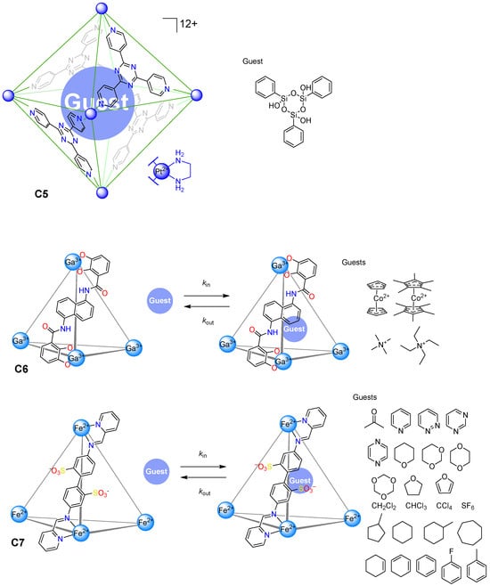 Examples of guest⊂cage complexes with metallo-organic cages C5–C7, showing guests with varying in–out exchange rates.