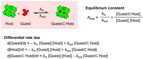 To explore the effects of the dilution, the binding constant strength, and the guest in–out activation energy, we modeled the host–guest encapsulation process considering the in-and-out processes involved in the encapsulation equilibrium (Figure 4). The in-step of guest encapsulation involved the reaction between a guest molecule and a host molecule; the step of the guest release involved a dissociative mechanism creating an empty cavity. This was a reasonable assumption considering the large host cavity occupancy required by the guest [87,88,89]. The complex formation step was, therefore, a second-order reaction, while the dissociative mechanism for the decomplexation step was a first-order reaction, with the corresponding equations described in Figure 4.
