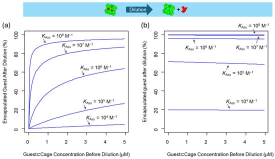 Percentage of encapsulated guest at different guest⊂cage concentrations after dilution considering different association constant values. (a) Dilution of a solution containing the guest⊂cage complex. (b) Dilution of a solution containing the guest⊂cage complex and an excess cage with a total cage concentration of 25 µM. KAss represents the guest–cage association constant. In the schematic representation of the guest, cage, and guest⊂cage complex, the guest is represented in red and the cage in green.