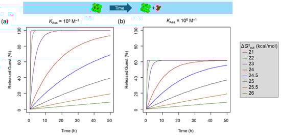 Guest release kinetics of from guest⊂cage complexes (1 µM) with different activation barriers for: (a) guest–cage association constant of 103 M−1, (b) guest–cage association constant of 106 M−1. ΔG‡out represents guest–out activation barrier and KAss the guest–cage association constant. In the schematic representation of the guest, cage, and guest⊂cage complex, the guest is represented in red and the cage in green.