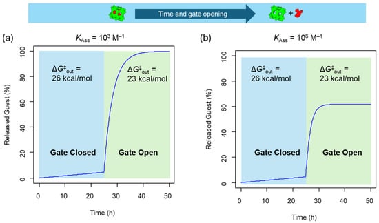 The “gate closed”–“gate open” systems are, therefore, ideal for biological applications due to their release properties. A last aspect to consider is the feasibility of preparing the guest⊂cage complex under chemical synthetic conditions. An effective guest⊂cage synthesis requires a high association constant to drive the formation of the host–guest complex. Therefore, from the synthetic point of view, an association constant of 106 M−1 would be preferred. However, as described in Figure 7b the high guest–cage affinity does not allow the complete release of the guest due to the encapsulation equilibrium. Developing a more sophisticated guest⊂cage system that simultaneously produces gate opening and affinity reduction in response to stimuli would be ideal. This can be achieved, for example, by partial or full cage disassembly (see Figure 2 for examples of stimuli that trigger the “gate open” event). We have simulated this, using the same conditions described in Figure 7, but adding to the reduction in the guest–out barrier in the “gate open” event a reduction in the association constant (Figure 8). The “gate open” event was introduced in the simulation by changing the energy barrier (ΔG‡out) and the association constant (KAss) at a certain time to simulate the chemical event that induced the gate opening with a reduction in the affinity towards the guest. This system has the ideal properties from a synthetic point of view, i.e., a high association constant that facilitates the guest⊂cage formation with a high out activation barrier that prevents the guest from escaping the cavity. Note that synthesis may require heating to achieve a suitable guest rate or to self-assemble the cage around the guest molecule. Then, when the gate is open, a reduction in both the guest–out energy barrier and the cage–guest affinity occurs, resulting in complete guest release. These guest⊂cage complexes have, therefore, ideal properties for in vivo studies.