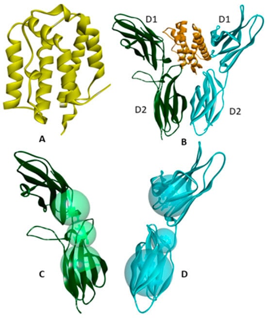 Ribbon structures of (A) IL-19, 1N1F.PDB, and (B) IL-20 ligand-bound IL-20 receptor, 4DOH.PDB, where the domains 1 and 2 are labeled. The prominent receptor cavities in (C) IL-20αR and (D) βB chains are displayed. D1 and D2 represent the domain structures.