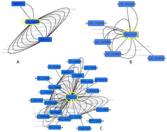 Protein–protein interaction network of (A) IL-19, (B) IL-20αR, and (C) IL-20βB.