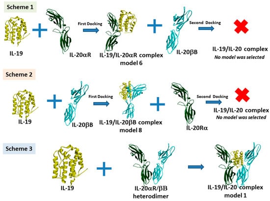 The schemes for three possible models emerge from the above considerations as follows: (1) IL-19 binds to IL-20αR first, (2) IL-19 binds to IL-20βB first, and (3) IL-19 binds to the heterodimeric receptor IL-20αβ. These postulated schemes are displayed in Figure 3. In scheme 1, the IL-19 has been docked to the IL-20αR first, and then the IL-19/IL-20αR complex has been docked to the -βB receptor. In the case of scheme 1, there are no suitable trimeric complexes as most of them undergo non-specific binding. Therefore, in our modeling experiment, an IL-19/IL-20αRβB complex formation was not identified. Surface plasmon resonance (SPR) analyses by previous authors also did not identify the IL-19/IL-20αR complex formation, though IL20/IL-20αR interactions were considered as a possibility [12]. The details of this scheme 1 are displayed in the SM 1 Figures S2 and S3.