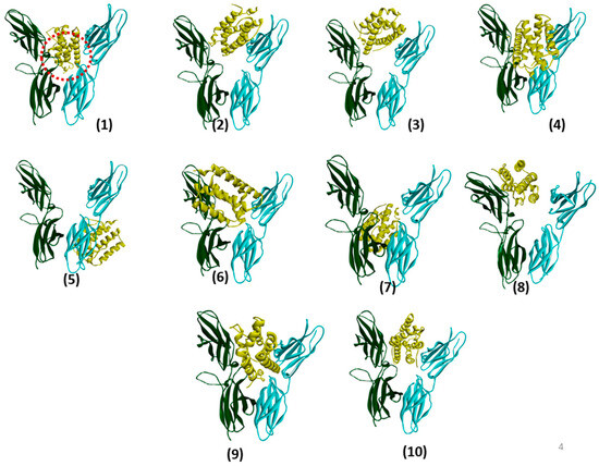 For the third scheme in Figure 3, the IL-20αβ receptor dimer and the IL-19 ligand were considered. The GrammX server successfully confirmed this scheme, and hence, we used its corresponding model 1 in Figure 4. The results in Figure 4 suggest that, except for two cases, the ligand-binding pocket in most of these models is the same, which is the groove between the two receptors. Models 3, 4, 9, and 10 are visually similar to model 1. In model 5, the ligand binds to beta receptor D2. Model 1 in Figure 4 will be denoted as model A in the remainder of this report. The 3D structure of model A is included and can be obtained from Supplementary Materials S2 (SM 2).