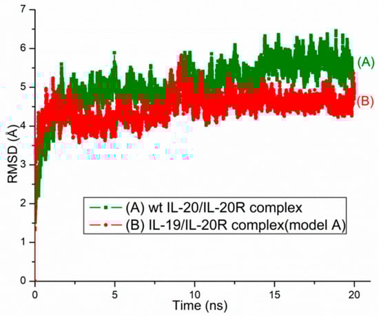 Several experimental conformational preferences and proofs of direct IL-19/IL-20R interactions, including SPR signal measurement, crosslinking, and molecular sieving, are plotted in Figure 2. Some of these experimental bases for this claim of IL-20R as IL-19 receptors have been identified by previous authors [12,17]. Thus, in addition to the direct interactions, the proteins’ meta-analyses were based on biological, largely functional, or correlative (e.g., co-expression) interactions. The structural quality of the IL-19/IL-20R model (model A) is evaluated by RMSD calculations and secondary structure analyses; based on the results, this model is found to be comparable to the IL-20/IL-20R wt protein complex.