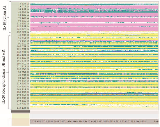 The secondary structure of model A does not manifest major structural variations with time (Figure 6). Therefore, the proposed model of the IL-19 ligand attached to the dimeric IL-20 receptor (α, β) seems kinetically stable and invariant with time. The color codes of secondary structure analysis are displayed in Figure S14. The secondary structural analyses of model B are also included in Figure S14.