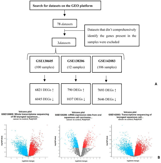 (A) Results from the search in GEO and GEO2R platforms. (B) Volcano plots of DEGs from the datasets identified on GEO.As shown in the volcano plot (B), differentially expressed genes with high statistical significance are highlighted, with the top DEGs marked for head and neck cancer.