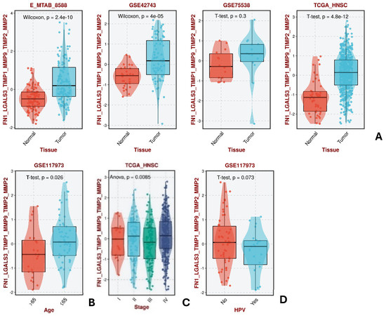Comparative analysis of combined gene expression data from the BEST platform between (A) normal and tumor tissues; and according to (B) the individual’s age; (C) tumor development stage; and (D) HPV infection status.