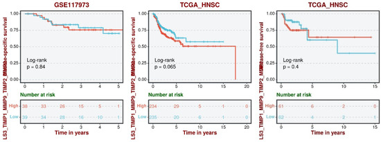 Hallmark analysis linked FN1, LGALS3, TIMP1, MMP9, TIMP2, and MMP2 to critical phenotypes such as epithelial–mesenchymal transition (EMT), the formation of cell junctions in muscle and epithelial cells, angiogenesis, and apoptosis. In addition, the genes were associated with several signaling pathways, including TGF-β, WNT, KRAS, TNF-α, NF-κB, NOTCH, and Hedgehog pathways. An examination of gene expression profiles associated with immunotherapeutic drugs revealed potential prognostic value for candidate genes in anti-PD-1/PD-L1 therapy, suggesting their relevance in the HNC immunotherapeutic landscape. However, no significant associations were found for other therapies, including anti-PD-1, anti-CTLA-4, CAR-T, or combined therapies such as anti-PD-1/CTLA-4 or anti-PD-L1.