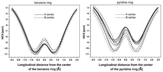 The set of data on the aromaticity of the compounds tested is completed with NICS-scan curves of the studied compounds, see Figure 4. This method nicely differentiates the two groups of studied compounds. The curves representing benzene-type rings of all studied compounds are overlapped. But it can be noticed that curves belonging to the A series compounds are at the beginning, above the curves of the series B compounds (left part), and then migrate to the bottom (middle part) and then are located in the middle between curves of different compounds of series B. In the case of the pyridine-type ring, curves of series A and B are almost separated; A compounds curves are at the top and B compounds curves are below them. Such data support the thesis that the aromaticities of the benzene-type ring are similar in both groups of studied compounds while the aromaticities of the pyridine-type ring for compounds of series A are lower.