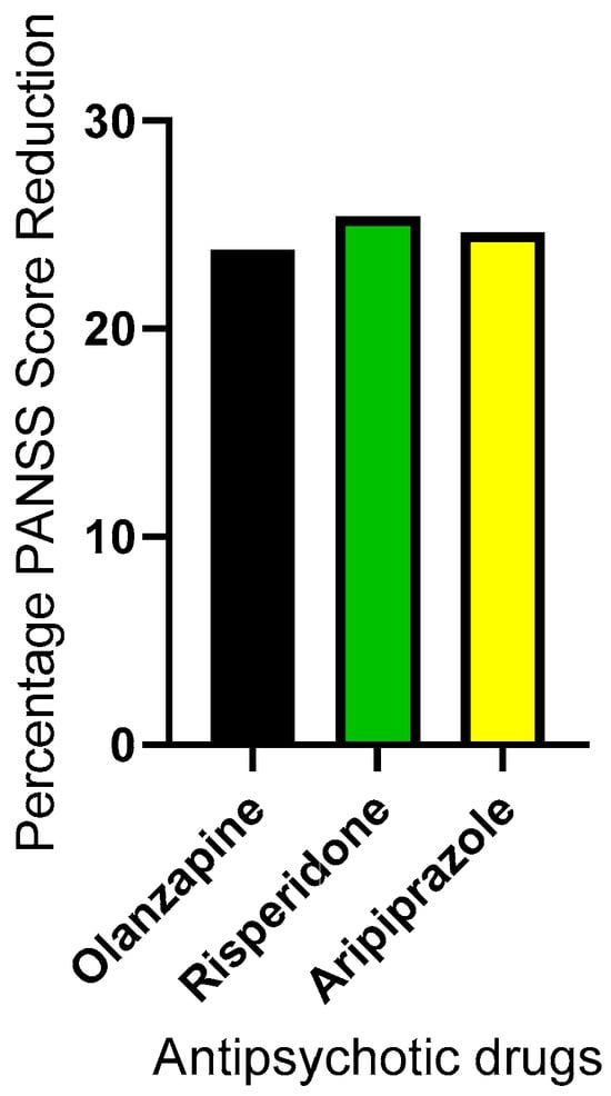 A bar graph showing the efficacy of Olanzapine, Risperidone, and Aripiprazole by examining the percentage reduction in the Positive and Negative Syndrome Scale caused by each antipsychotic drug [38].