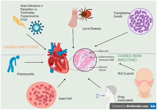 Infective and non-infective causes of myocarditis. Infective causes include infectious triggers such as viral infections, i.e., adenovirus, parasites, lyme disease, and toxoplasma gondii. On the other hand, non-infective causes include non-infectious triggers, such as polymyositis, lupus, and inflammation, caused by giant-cells or induced by drugs, i.e., antibiotics. Both infective and non-infective causes contribute to the inflammation of myocardium, causing myocarditis. Both types of myocarditis may present similarly, i.e., with chest pain, dyspnea, and palpitations; however, the underlying triggers and mechanisms of each type may differ.