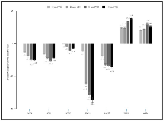 Effects of VitD3 administration on cellular growth. Growth of normal cell lines HGF-1 and OKF4 increased at all concentrations evaluated (range: from 10.6% to 19.3%) compared to that of baseline control cells (0 nmol). Differential inhibition was observed with the oral cancer cell lines, including SCC15 (range: from −0.4% to −3.9%), SCC4 (range: from −6.6% to −12.8%), SCC9 (from −7.8% to −13.2%), CAL27 (from −9.9% to −17.9%), and SCC25 (from −6.1% to −43.1%).