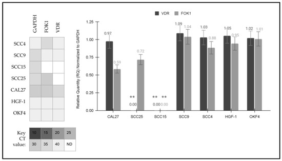 Screening for expression of Vitamin D receptor (VDR) and FOK1 polymorphism. Expression of VDR was observed among HGF-1, OKF4, SCC4, SCC9, and CAL27 cells, but not found within SCC15 or SCC25 cells. Expression normalized to internal control GAPDH revealed consistent VDR expression, ranging from 0.97 (CAL27) to 1.09 (SCC9). FOK1 polymorphism expression was observed among SCC4, SCC9, SCC25, CAL27, OKF4, and HGF-1 cells, but not among SCC15 cells. Normalized expression data revealed more variable expressions of FOK1, ranging from 0.59 (CAL27) to 1.04 (SCC9). ** denotes below limit of qPCR screening detection. Relative quantity (RQ) is the cycle threshold (CT) value normalized to internal positive control (GAPDH).