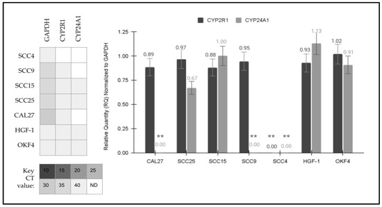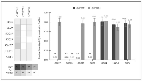 Screening for expression of VitD3 hydroxylate enzymes. CYP27A1 was only expressed in SCC4, OKF4, and HGF-1 lines, with no expression observed among (SCC9, SCC15, SCC25, and CAL27) with normalized expression data ranging between 0.94 (HGF-1) and 1.02 (SCC4). In contrast, expression of CYP27B1 was expressed among cell lines (SCC4, SCC9, SCC15, CAL27, OKF4, and HGF-1), with exception of SCC25 cells. Normalized expression for CYP27B1 ranged between 0.87 (HGF-1) and 1.03 (SCC4). ** denotes below limit of qPCR screening detection.