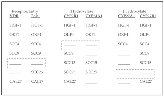 The evaluation of the effects of VitD3 administration on cellular growth was cross-referenced with the expression of the key experimental variables from this study (Figure 5). These data clearly demonstrated that the normal, non-cancerous cell line HGF-1, which responded with increased growth at all the concentrations of VitD3 administration evaluated, expressed the main entry mechanisms for VitD3 (VDR and FOK1), as well as the major metabolic conversion pathways, including hydroxylase (CYP2R1 and CYP24A1) and hydroxylate (CYP27A1 and CYP27B1) enzymes. Although differential results were observed among each of the oral cancer cell lines individually, two unique expression differences were identified among the oral cancers that exhibited the least and most responsive inhibition to VitD3 administration, SCC15 and SCC25, respectively. More specifically, each of the oral cancers expressed either VDR, FOK1, or both, except for the least responsive cell line (SCC15), which did not express either of these receptor or entry-related mRNAs. In addition, each of the cell lines expressed one or both of the major hydroxylate enzymes (CYP27A1 and CYP27B1), with the exception of the most responsive cell line (SCC25), which was missing both of these major metabolic pathway enzymes. One additional finding was the expression of one or both of the major hydroxylase enzymes (CYP2R1 and CYP24A1) among each of the cell lines evaluated, with the exception of SCC4.