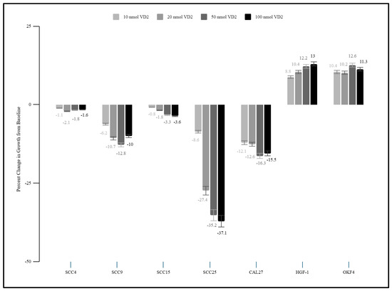 Due to the observation that the hydroxylase enzymes (CYP2R1 and CYP24A1) responsible for the conversion of VitD2 were not expressed in the SCC4 cells, growth and viability assays were performed with and without the addition of VitD2 in three additional independent experiments (Figure 6). These data demonstrated the normal, non-cancerous cell lines HGF-1 and OKF4 exhibited an increase in growth over three days at all the concentrations evaluated (HGF-1 range: from +8.8%, p = 0.055, at 10 nmol to 13.0%, p = 0.048, at 100 nmol; OKF4 range: from +10.4%, p = 0.0468, to 11.3%, p = 0.049, at 100 nmol) compared with that of the baseline control cells (0 nmol). In addition, differential results were then observed with the oral cancer cell lines with minimal effects observed in growth with both SCC15 (−0.8%, p = 0.711, at 10 nmol and −3.6%, p = 0.339, at 100 nmol) as well as the SCC4 cells (from −1.1% to −1.6%, p = 0.49) over the concentration range of 10 nmol to 100 nmol. More moderate effects on cell growth were observed with the SCC9 (from −6.2% to −10.0%, p = 0.052) and CAL27 (from −12.1% to −15.5%, p = 0.046) cells with the most robust inhibition observed among the SCC25 cell line (from −8.6% to −37.1%, p = 0.032).