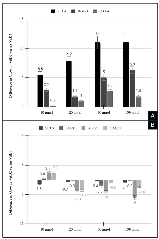 Differences in cellular responses to VitD2 and VitD3 administration among oral cell lines. (A) Positive, but non-significant differences were observed in growth among cell lines HGF-1 (range from +1.8% to +6.5%, p > 0.05), OKF4 (range: from 0.2% to 2.7%, p > 0.05), and SCC4 cells at lower concentrations, but significant differences were revealed with SCC4 at higher concentrations of 50 and 100 nm (+11% and +11%, respectively, p = 0.041). (B) No significant differences were observed among other oral cancer cell lines, including SCC9 (range: from −0.4% to −1.6%, p > 0.05), SCC15 (range: from +0.4% to −2.2%, p > 0.05), SCC25 (from +2.5% to −6.0%, p > 0.05), and CAL27 (from +2.2% to−3.6%, p > 0.05) across concentrations evaluated (from 10 to 100 nmol).
