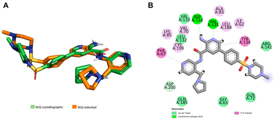 (A) Redocking result for serine/threonine kinase GSK-3β. Ligand configuration obtained from redocking in orange and 2-Amino-5-{(4-Methylpiperazin-1-yl)sulfonyl}-N-[4-(Pyrrolidin-1-ylmethyl)Pyridin-3-yl]Pyridine-3-Carboxamide in green (PDB code: 6LQ). (B) Two-dimensional interactions between ligand and protein. The spheres containing the residues are colored accordingly with the interaction with the ligand, with van der Waals interactions in light green, hydrogen bonds in green and pi-pi stacking in pink.