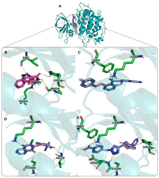 An RMSD value lower than 2.0 Å is considered satisfactory for the parameters to be applied in docking simulations with the most active inhibitors, 3, 5, and 10. The best configuration of each inhibitor was selected and analyzed with PyMOL(TM) 3.1.1 software and Proteins Plus (http://proteins.plus, accessed on 30 July 2024). The main interactions between the best configuration of inhibitors 3, 5, and 10 and the protein were highlighted as described.