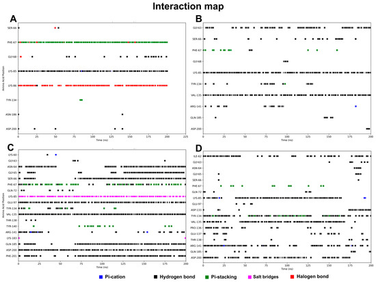 In addition to these analyses, the interaction map obtained further contributes to the interpretation of the stability generated in each complex. In the simulation of GSK-3 with compound 3 (Figure 4A), it can be observed that the ligand interacts predominantly with Phe67, Lys85, and Lys86 throughout the simulation, which are interactions observed in docking. These interactions are mainly of the hydrogen bond, halogen, and pi-stacking type.