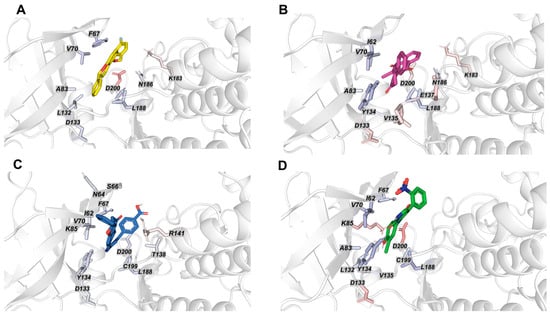 The interaction pattern of the catalytic residues in SB415286 can be seen in the interaction map in Figure 4C, which was created for comparison with simulations of the derivatives. A clear similarity between the residues is noted in the simulations in which the residues with the longest residence times and interactions were Ile62, Lys85, Tyr134, Val135 Arg141, and Asp200. These interactions were principally of the hydrogen bond type, and we highlight the proximity of the residue Phe67 to those performing pi-stacking interactions. As seen in this interaction pattern, the simulation complexed with 10 surpassed the stability of the predicted interactions in addition to maintaining additional interactions with important residues. The predominant interactions are still of the hydrogen bond type, and we highlight greater stability with the residues Asn64, Gly65, Ser66, Phe67, and Lys85. Glu97, Val135, Gly185, Asp200, and Phe201 were also observed in other studies. Thus, we were able to compare the conformational stability that each ligand provides in the GSK3-β structure and justify the activities observed in the assays.