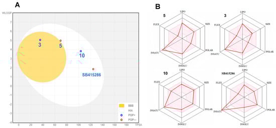 (A) BOILED-Egg graph for GSK-3β inhibitors 3, 5, 10, and SB415286. (B) Bioavailability Radar for the most active GSK-3β inhibitors 3, 5, and 10, and commercial inhibitor SB415286. The colored region is the specific physicochemical space for predicted oral bioavailability calculated by SwissADME with the darker red line representing the compound performance in the specific physicochemical characteristic.