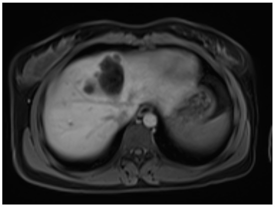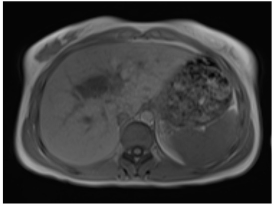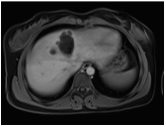 Second MRI scan: Axial T1W native MRI scan, where the floating membranes are rather difficult to depict, with the hypointense area in liver segment IV showing the cyst.