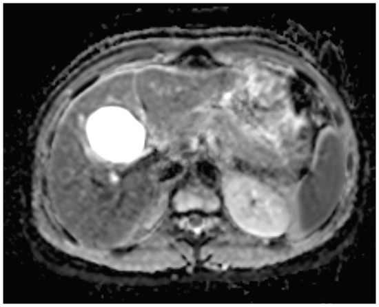 Axial ADC map MRI scan showing a hyperintense area in liver segment IV, a typical depiction of cysts.