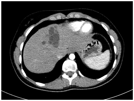 A 23-year-old female patient presented with nausea, fatigue, and loss of appetite to the emergency department for 6–8 weeks. An abdominal examination did not reveal any significant findings. Laboratory blood tests showed elevated AST 62 (U/L), ALT 74 (U/L), and GGT 107 (U/L). In addition, the eosinophil count was elevated up to 10%. Leucocytes were in a normal range of 7.98 Tsd/μL, as well as C-reactive protein with 1.2 mg/L. The ESR showed no abnormality with a value of 16 mm.
