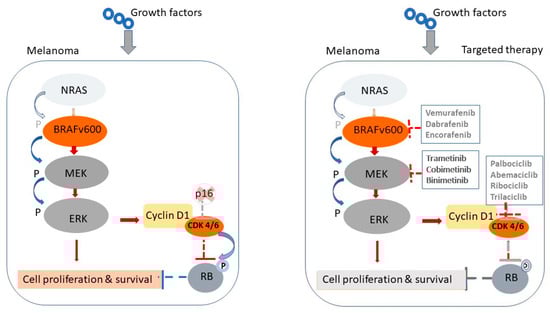 Mechanisms of MAPK pathway activation in melanoma and sites of targeted therapeutic intervention. Schematic representation of the MAPK signaling pathway in melanoma and its inhibition by targeted therapies. Left panel: In untreated melanoma cells with BRAF^V600 mutations, growth factor signaling through NRAS leads to constitutive activation of the BRAF–MEK–ERK cascade, resulting in upregulation of Cyclin D1, CDK4/6 activation and unchecked cell proliferation and survival. Right panel: Targeted therapies disrupt this pathway at multiple levels. BRAF inhibitors (e.g., vemurafenib, dabrafenib, encorafenib) and MEK inhibitors (e.g., trametinib, cobimetinib, binimetinib) block downstream signaling. CDK4/6 inhibitors (e.g., palbociclib, abemaciclib, trilaciclib) further inhibit cell cycle progression by restoring control at the G1 checkpoint, reducing the proliferation of melanoma cells.