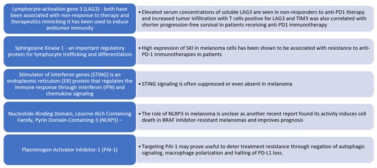 Altered immune signaling in malignant melanoma. Emerging molecular targets associated with resistance to PD-1 immune checkpoint inhibition in melanoma. We summarize several key molecular regulators that have been implicated in primary or acquired resistance to anti-PD-1 immunotherapy in melanoma.