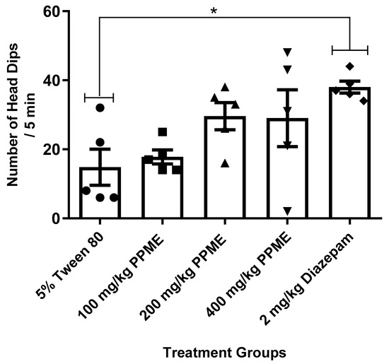 When compared to the 5% Tween 80, the number of head dips was not significantly affected by any of the PPME doses (100, 200, or 400 mg/kg) administered. Meanwhile, diazepam significantly (p < 0.05) increased the number of head dips (Figure 1).
