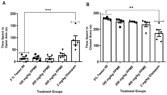Effect of P. pinnata methanol leaf extract (PPME) on time spent in the open (A) and closed (B) arms of an elevated plus maze. ** p < 0.01; *** p < 0.001 versus 5% Tween 80. n = 5 per group.