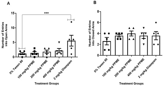 Effect of P. pinnata methanol leaf extract (PPME) on the number of entries into the open (A) and closed (B) arms of an elevated plus maze. *** p < 0.001 versus 5% Tween 80. n = 5 per group.