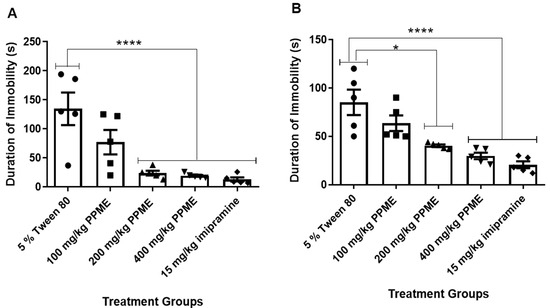 While the dose of 100 mg/kg had no significant effect on the duration of immobility in FST, the doses of 200 and 400 mg/kg significantly (p < 0.0001) decreased this parameter in comparison with 5% Tween 80 (Figure 4A). In the tail suspension model (Figure 4B), 100 mg/kg PPME did not significantly affect the duration of immobility, but doses of 200, and 400 mg/kg significantly (p < 0.0001) decreased this index in comparison with 5% Tween 80.
