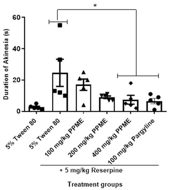 Effect of P. pinnata methanol leaf extract (PPME) on duration of reserpine-induced akinesia. * p < 0.05 versus 5% Tween 80. n = 5 per group.