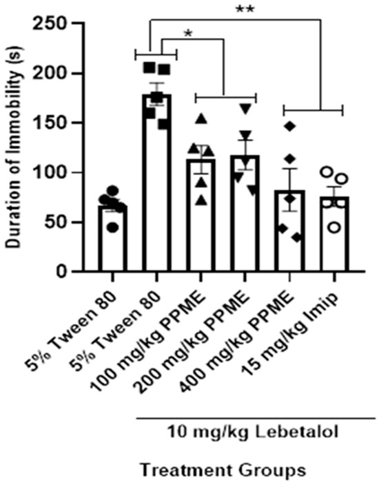 Labetalol (10 mg/kg) was administered subcutaneously to mice in all groups. Thirty minutes after, group I received 7 mL/kg of 5% Tween 80 orally, while groups II, III, and IV received oral doses of 100, 200, and 400 mg/kg PPME, respectively. Group V was administered 15 mg/kg imipramine orally. One hour later, the mice in each group were individually exposed to a forced swim test, as described earlier.