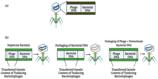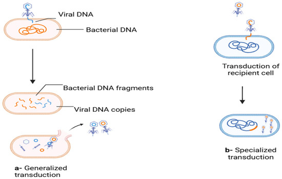 Generalized and specialized transduction responsible for ARGs’ transmission. (a) In the lytic cycle, fragments of the bacterial genome are packaged mistakenly into the viral capsids (orange color represents bacterial DNA while blue is for viral DNA); (b) in temperate phages, during induction, a part of adjacent bacterial DNA is excised along with the viral genome and packaged into the capsid (blue color represents bacterial DNA and orange is for viral DNA) [30]. (Figure created through Biorender).