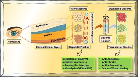 Extracellular Vesicle-associated microRNAs (EV-miRNAs) are emerging as pivotal regulators of corneal health and disease, holding exceptional promise for transforming both diagnostics and therapeutics. These vesicles carry distinct miRNA signatures in biofluids such as tears, offering a powerful, non-invasive approach for early detection, risk stratification, and dynamic monitoring of corneal disorders. In addition, EV-miRNAs act as key mediators of critical biological processes, including inflammation, fibrosis, and tissue repair. Consequently, they represent attractive therapeutic targets; for example, engineered EVs loaded with miRNA mimics or inhibitors can precisely modulate these pathways to promote regeneration and suppress disease progression. Yet, despite this considerable promise, the translation of EV-miRNA research into clinical practice remains constrained by several challenges. Topmost among these are the lack of standardized EV isolation methods, variability in miRNA quantification, and the pressing need for regulatory frameworks tailored to the complexity of these biological therapeutics. Addressing these barriers is essential to ensure reproducibility, scalability, and safety in clinical applications. Accordingly, this review synthesizes current knowledge on EV-miRNA profiles in corneal diseases, critically evaluates their diagnostic and therapeutic potential, and highlights strategies to overcome existing technical and regulatory limitations. Ultimately, the successful integration of EV-miRNA-based approaches into personalized medicine frameworks could revolutionize the management of corneal diseases and substantially improve patient outcomes. Full article