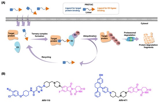 (A) Schematic illustrating the mechanism of action of PROTACs. (B) Chemical structures of PROTAC-based drug candidates, ARV-110 and ARV-471.