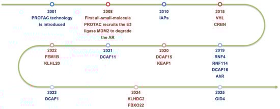 Timeline of the first use of E3 ligases in small-molecule PROTAC technology.