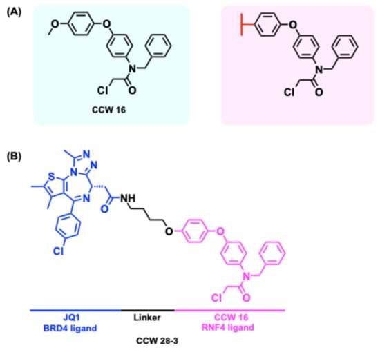 In 2019, the Nomura group employed an activity-based protein profiling (ABPP) [44,45,46,47] covalent ligand screening platform to identify new chemical starting points for E3 ligase recruiters [48]. The screen identified TRH 1-23 as a hit that covalently binds to RING finger protein 4 (RNF4), an E3 ubiquitin ligase for which no chemical tools previously existed. Mass spectrometry analysis revealed that TRH 1-23 modifies the zinc-coordinating cysteines C132 and C135 within the RNF4 RING domain. Importantly, this binding was found to be non-functional, as it did not inhibit the autoubiquitination activity of RNF4, suggesting a non-functional binding mode suitable for ligase recruitment. Through structural optimization of this initial hit, they developed a more potent ligand, CCW 16, with an IC50 of 1.8 μM. To demonstrate its utility, CCW 16 was incorporated into a PROTAC degrader, CCW 28-3, by linking it to JQ1, a known inhibitor of the BET bromodomain protein family (Figure 3) [48]. CCW 28-3 demonstrated higher binding affinity for RNF4 than CCW 16, with an IC50 of 0.54 μM in competitive inhibition assays, successfully achieving degradation of bromodomain-containing protein 4 (BRD4) protein via both proteasome- and RNF4-dependent mechanisms. While acknowledging that the degradation efficiency and cellular target engagement of CCW 28-3 were modest compared to established degraders and that further optimization is needed, the study serves as a critical proof-of-concept. It validates the use of chemoproteomics-enabled covalent screening to successfully expand the arsenal of E3 ligase recruiters.