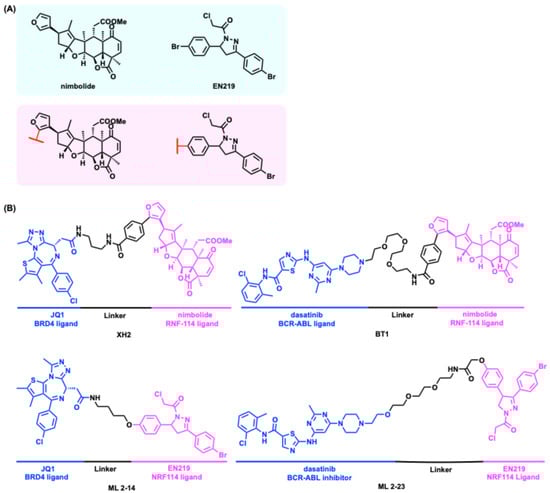 (A) Chemical structures of the RNF114 E3 ligase ligands. Red wavy lines indicate the typical attachment points for linker conjugation in PROTAC design. (B) Chemical structures of the RNF114-based PROTAC degraders.