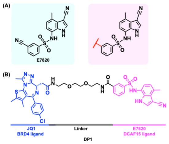 In 2020, the Chen group reported a novel BRD4 degrader DP1 by conjugating the DDB1 and CUL4-associated factor 15 (DCAF15) ligand E7820 with the BRD4 inhibitor JQ1 (Figure 6), which can induce persistent degradation of the target protein and demonstrates therapeutic potential against hematological malignancies both in vitro and in vivo [59]. Although the current drug activity is not high, requiring μM levels to achieve better degradation, this study provides a series of evidence proving that DCAF15 can serve as a supplement to the limited E3 ligases in PROTAC design. In 2024, Lucas et al. optimized the SPLAM sulfonamide E7820 into the 53 nM DCAF15 ligand and generated a series PROTACs. Only one degraded BRD4, but competition and knockout assays showed the effect was DCAF15-independent [60]. Their study highlights that potent glue ligands do not guarantee functional PROTAC warheads and warns against using BRD4/JQ1 models without rigorous proof of mechanism.