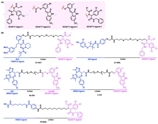 (A) Chemical structures of PROTAC moiety that recruits the DCAF11 E3 ligase. Red wavy lines indicate the typical attachment points for linker conjugation in PROTAC design. (B) Chemical structures of the DCAF11-based PROTAC degraders.