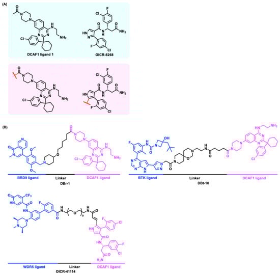 (A) Chemical structures of PROTAC moiety that recruits the DCAF1 E3 ligase. Red wavy lines indicate the typical attachment points for linker conjugation in PROTAC design. (B) Chemical structures of the DCAF1-based PROTAC degraders.
