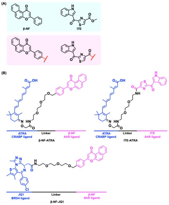 (A) Chemical structures of the AhR E3 ligase ligands. Red wavy lines indicate the typical attachment points for linker conjugation in PROTAC design. (B) Chemical structures of the AhR-based PROTAC degraders.
